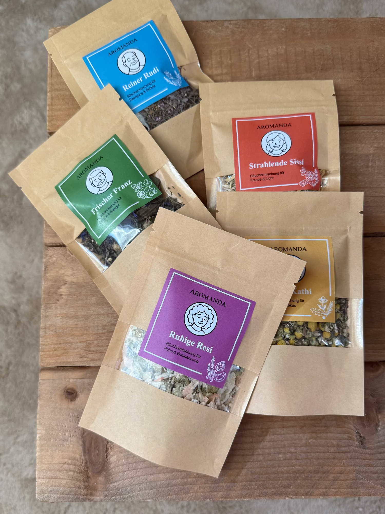 Aromanda ist aus unserer eigenen Freude am Räuchern entstanden. Jede Mischung ist ein Stück Herzblut – von uns entworfen, von Hand abgefüllt und mit Liebe für dich verpackt.