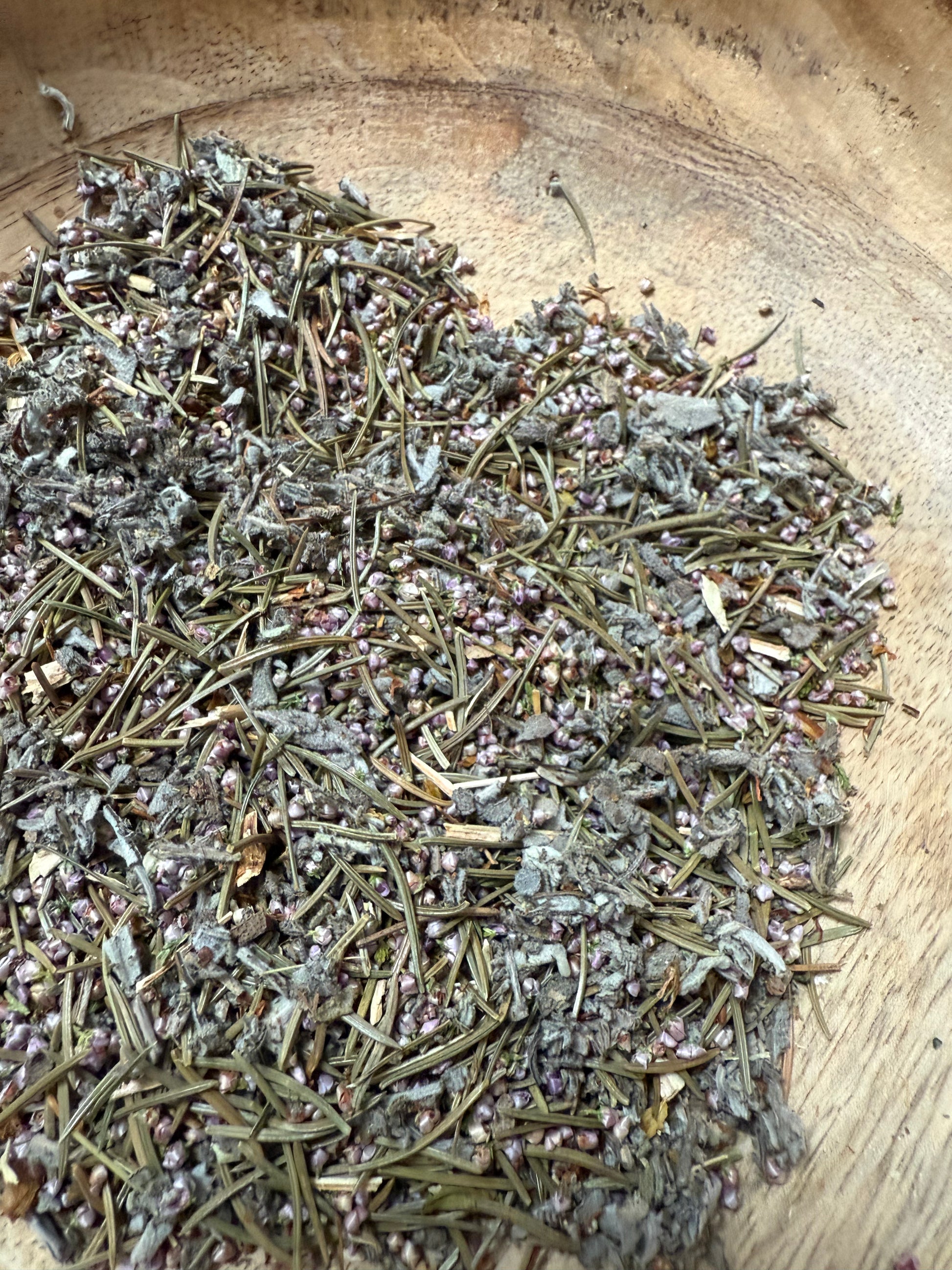 Unsere handgemachte Räuchermischung zur energetischen Reinigung vereint die kraftvollen Kräuter Salbei, Johanniskraut, Erikablüte und Fichtennadeln – traditionell eingesetzt für Reinigung, Schutz und neue Klarheit im Raum.
