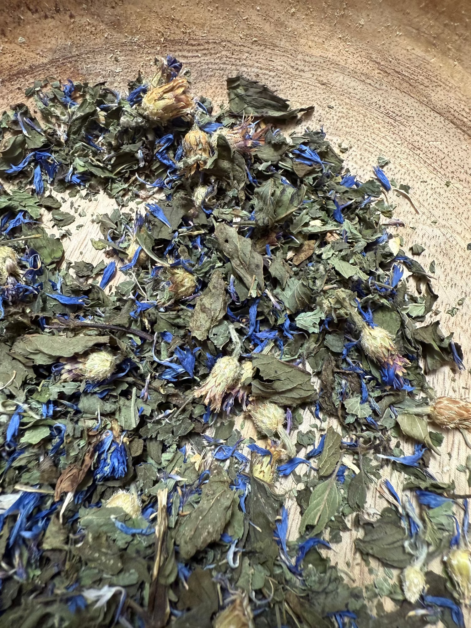 Ingwerwurzel, Kornblume, Melissenblätter, Pfefferminzblätter