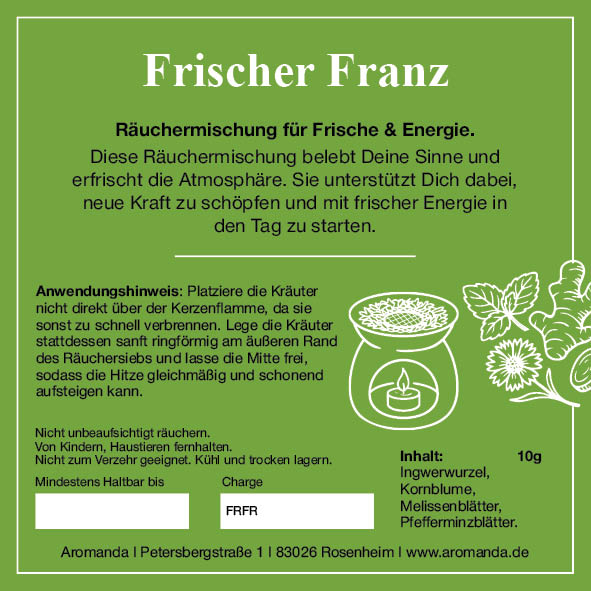Wenn’s mal wieder Zeit ist, alten Ballast hinter sich zu lassen und neue Frische einzuatmen – dann ist Frischer Franz genau das Richtige. Unsere handgemachte Räuchermischung für Loslassen, Frische & Neubeginn vereint wärmende Ingwerwurzel, zarte Kornblume, sanfte Melissenblätter und belebende Pfefferminzblätter – traditionell bekannt dafür, neue Energie zu schenken und den Geist zu erfrischen.